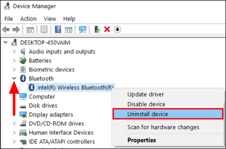 In the ‘Device Manager’ locate the ‘Bluetooth’ option and double-click on it to reveal the drivers. Next, right-click on the Bluetooth driver and select ‘Uninstall device’ from the context menu. A pop-up now appears on the screen, click on ‘Uninstall’ to confirm.
