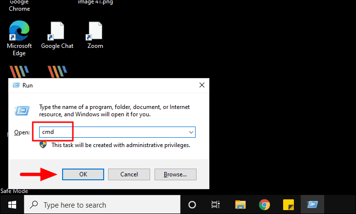 Once in the ‘Safe’ mode, press WINDOWS + R to launch the ‘Run’ command. Next, enter ‘cmd’ in the text box and either press ENTER or click on ‘OK’ at the bottom to open ‘Command Prompt’.