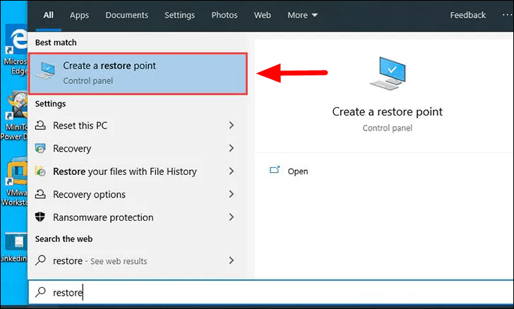 After you are in the ‘Safe’ mode, search for ‘Restore Point’ and then click on ‘Create a restore point’ from the search results.