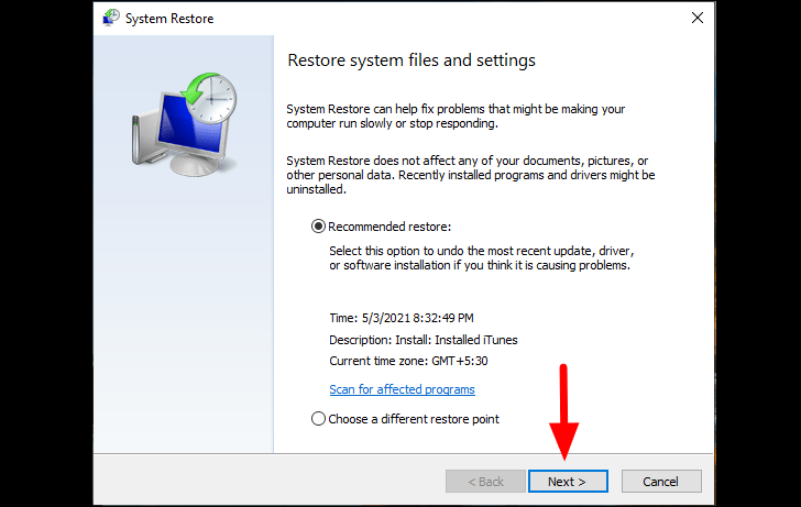 Once the ‘System Restore’ window, you have the option to either go with the recommended restore or chose another desired restore point. If you have created a restore point manually, you can opt for the ‘Choose a different restore point’, otherwise the ‘Recommended Restore’ will do the job. Once you have selected the preferred setting, click on ‘Next’ at the bottom.
