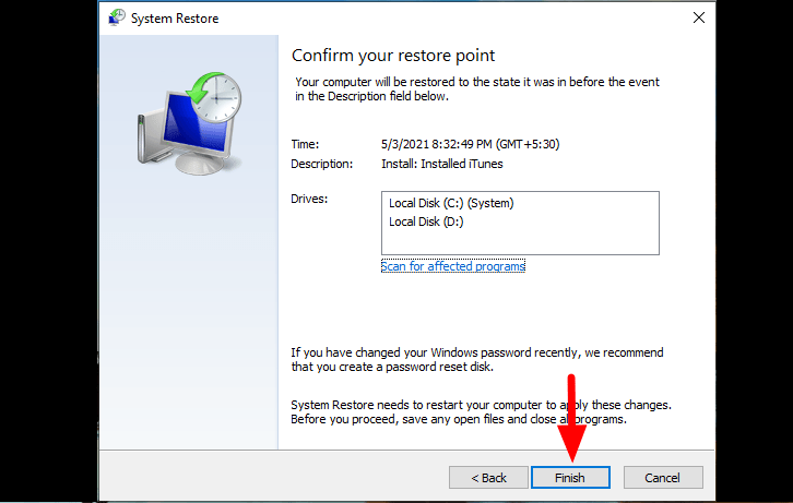 On the last page, verify the restore point details and then click on ‘Finish’ at the bottom. Before you click on ‘Finish’, save the files and data that you are working on since the system will restart.