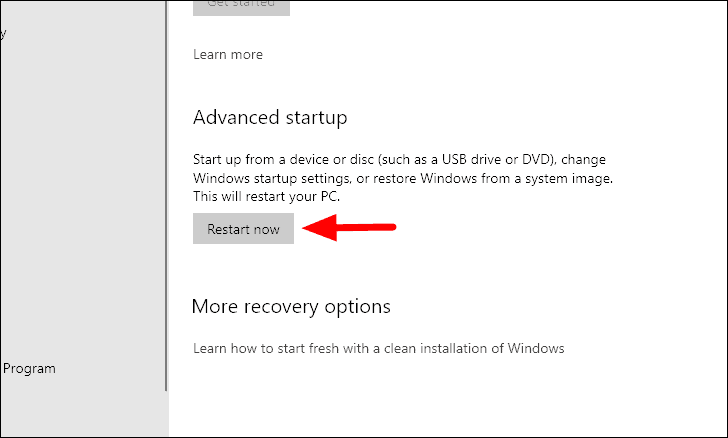 In the ‘Recovery’ tab, click on the ‘Restart now’ option under ‘Advanced startup’.