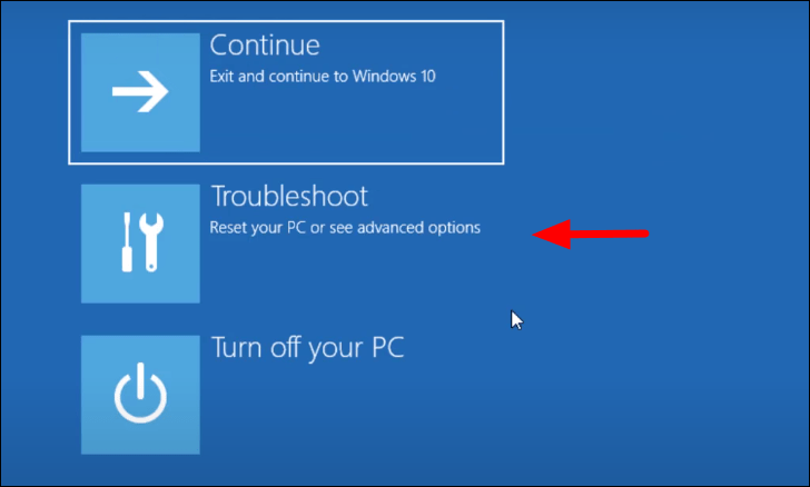 Your computer will now restart and will enter the recovery environment. On the ‘Choose an option’ screen, click on the ‘Troubleshoot’ option.