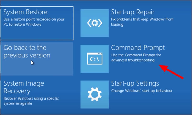 You will now find multiple advanced options on the screen. Select ‘Command Prompt’ from the list of options.