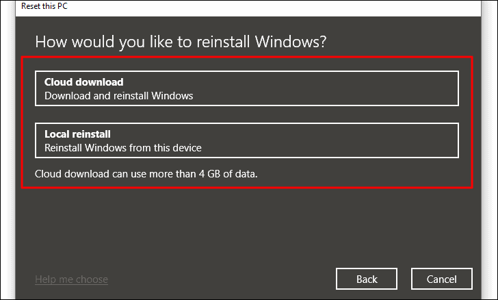 Next, select whether you would like to reinstall the Windows from ‘Cloud’ by downloading it or reinstall it from the system itself.