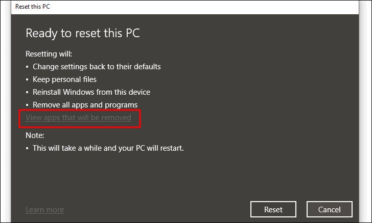 This is the final screen before the Windows is reset. You can view here what changes will be made once the reset is done. Also, you can view the apps that will be removed after reset.