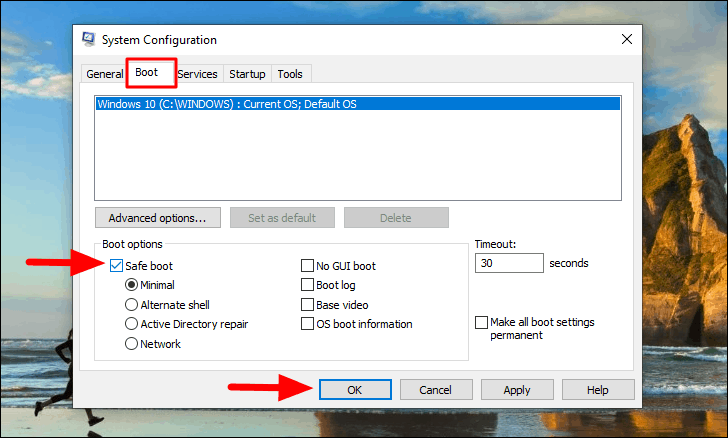 Now, select the ‘Boot’ tab from the top and then tick the checkbox for ‘Safe boot’ under ‘Boot options’. Finally, click on ‘OK’ at the bottom.