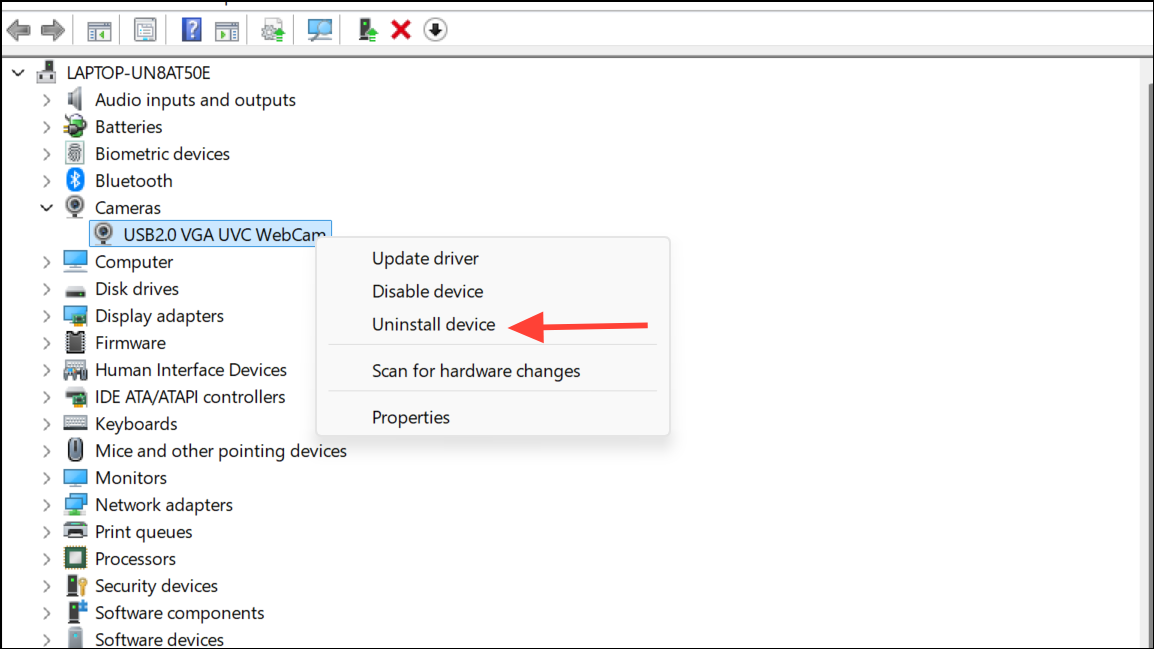 Step 4: For persistent issues, right-click the camera and choose Uninstall device. Confirm the removal, then restart your PC. Windows will attempt to reinstall the default driver during reboot.