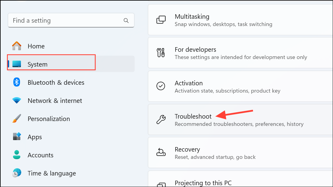 Step 1: Open the Windows Settings by pressing Windows + I. In the left pane, click System, then select Troubleshoot.