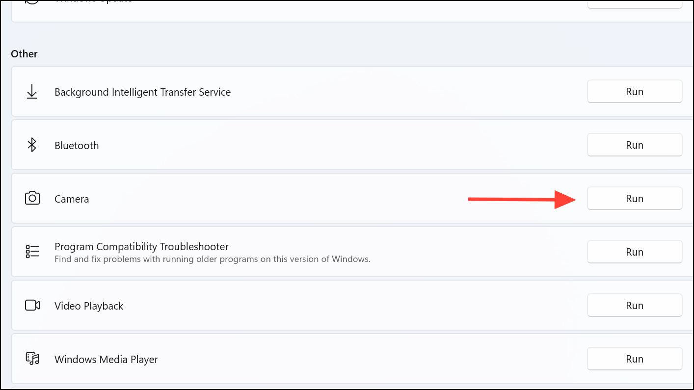 Step 2: Click on Other troubleshooters. Locate the Camera section and click Run. The troubleshooter will automatically detect and attempt to fix camera-related issues, including misconfigured services and registry conflicts.