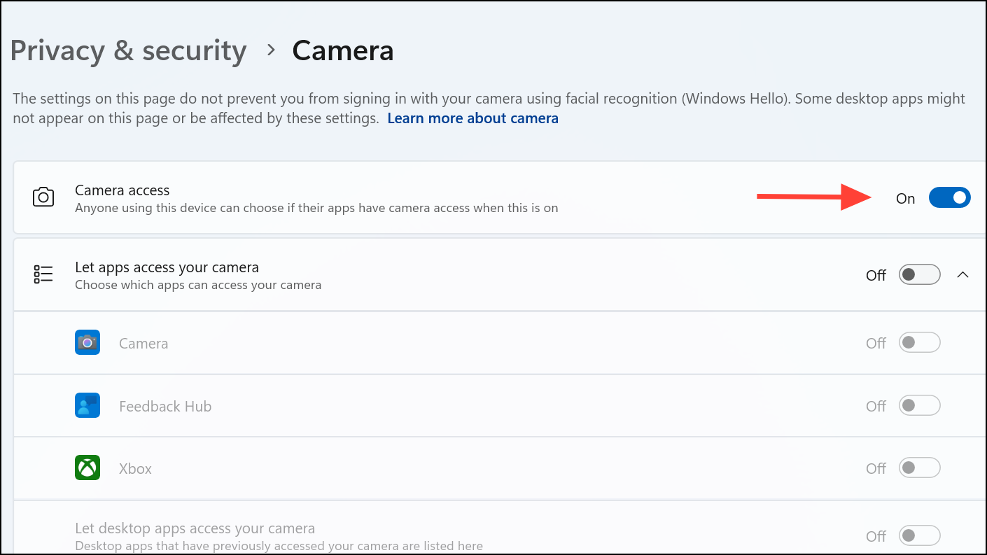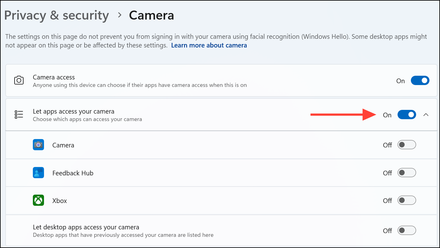 Step 3: Review the list of installed apps. Turn on camera access for each app you want to use. For desktop applications (like browsers or video conferencing tools), make sure Let desktop apps access your camera is also enabled.