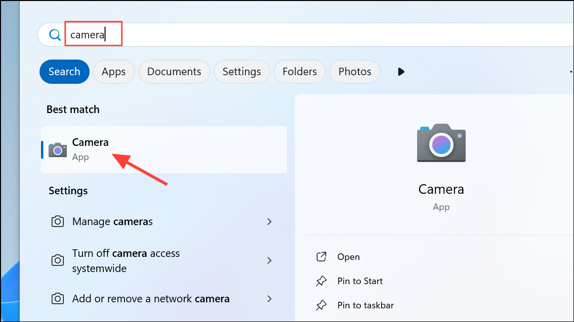 Step 1: Click the Start menu and type Camera, then launch the Camera app.