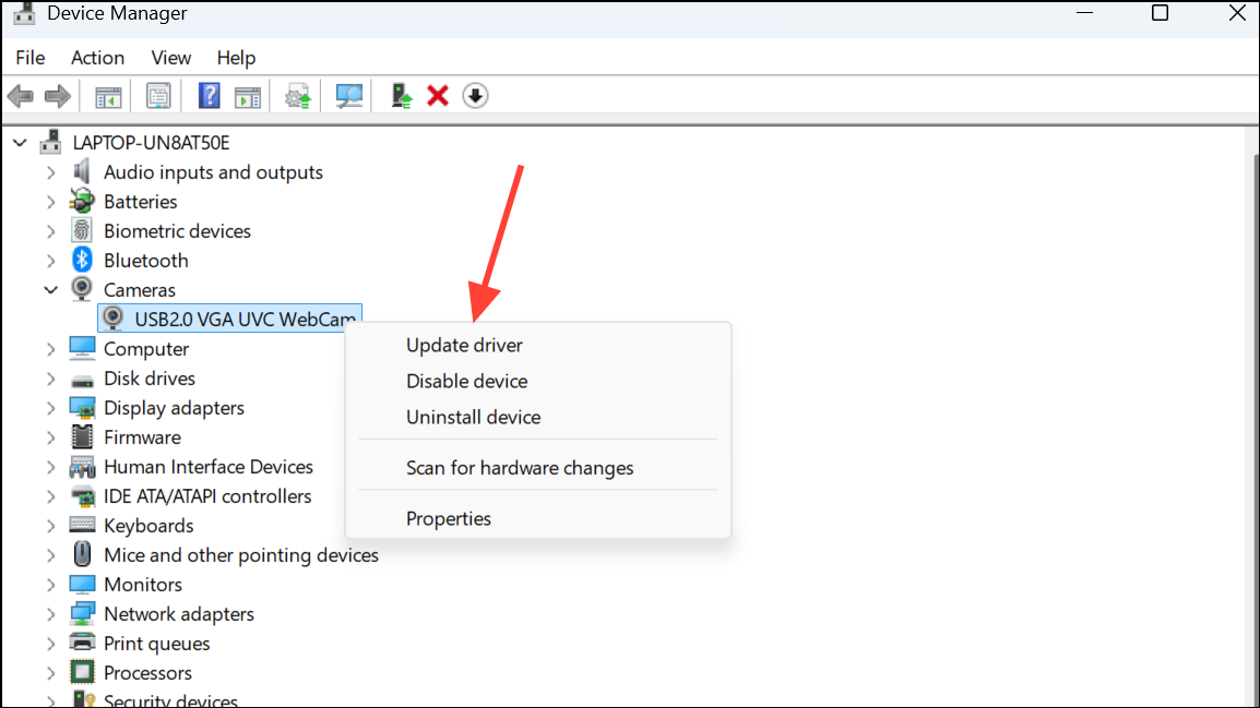 Step 2: Expand the Cameras section. Right-click your webcam and choose Update driver. Select Search automatically for drivers to let Windows find and install the latest version.