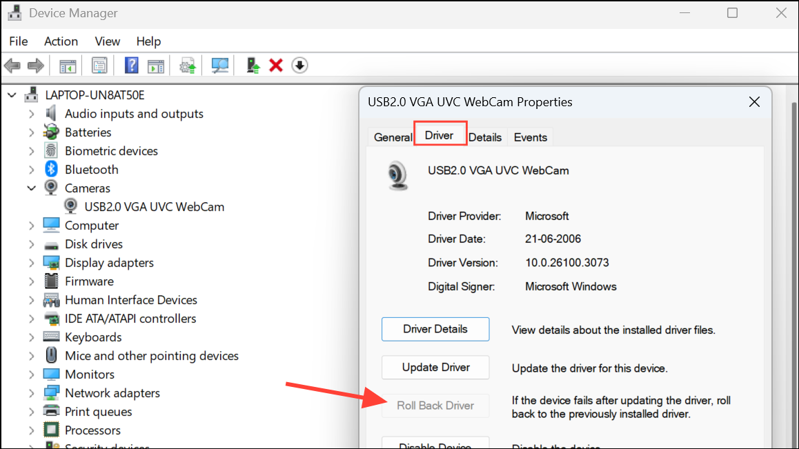 Step 3: If the camera stopped working after a recent update, right-click the camera device, select Properties, go to the Driver tab, and click Roll Back Driver if available. This returns the driver to its previous, working version.