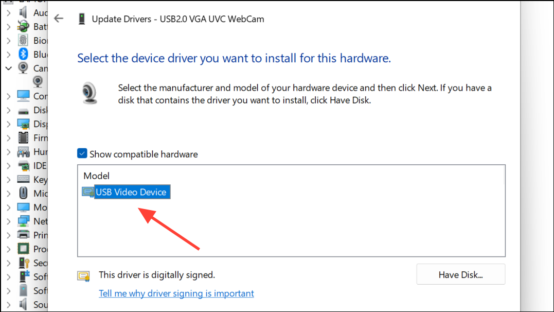 Step 3: Select USB Video Device from the list and click Next to install the standard UVC driver.