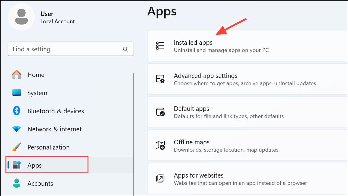 Step 1: Open Settings and navigate to Apps > Installed apps. Find the Camera app in the list.