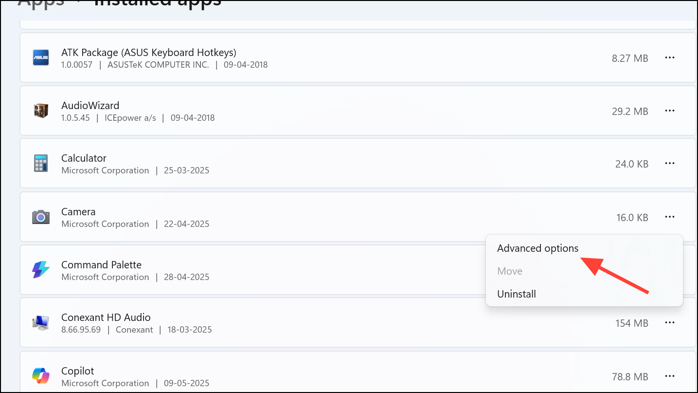 Step 2: Click the three-dot menu next to Camera and select Advanced options.