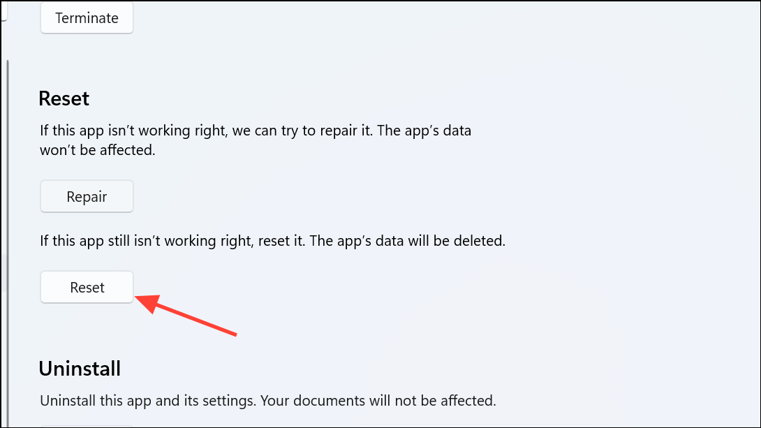 Step 3: Scroll down and click Reset. Confirm the reset if prompted.