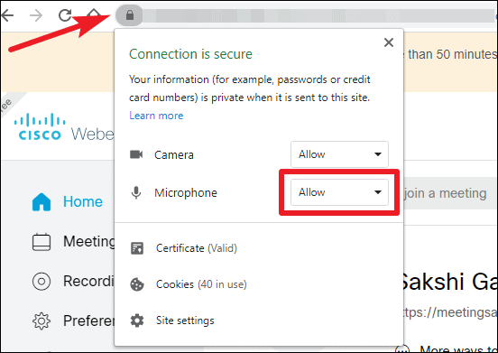 After opening your Webex meeting space on the browser, click on the ‘lock’ icon on the left of the address bar. Then ensure that the setting for ‘Microphone’ says ‘Allow’. If it doesn’t, expand the drop-down menu and select ‘Allow’ from it.