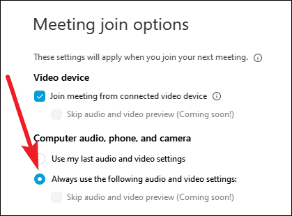 If the setting ‘Use my last audio and video’ is selected, then change it to ‘Always use the following audio and video settings’ and configure the camera and microphone settings to use the devices you desire.