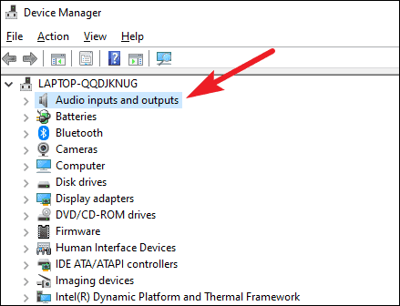 From the list of the drivers, find the ‘Audio inputs and outputs’ option, and click on the downward arrow next to it to expand the devices.