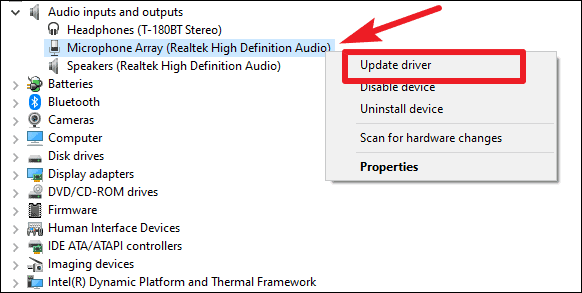 Then, go to your microphone on this list and right-click on it. Now select ‘Update driver’ from the menu.