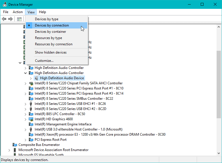 - Click on the High Definition Audio Device to select it and then click the View menu and select Devices by connection.