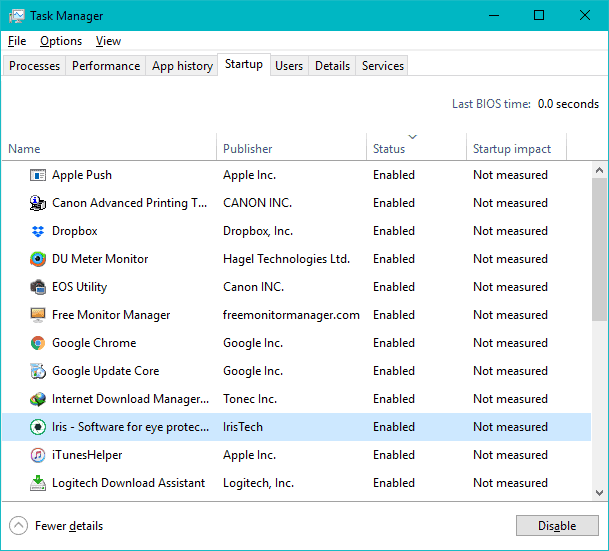- Select each enabled program under the Startup tab, and click the Disable button bottom left corner of the window.