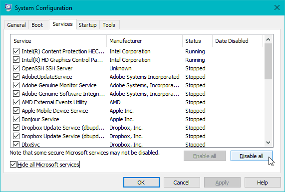 - Click the Services tab, then tick/check the Hide all Microsoft services at the bottom of the window.