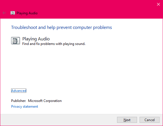 to open the Start menu, type Find and fix Audio playback problems and select it. - Click Next on the Troubleshoot window.