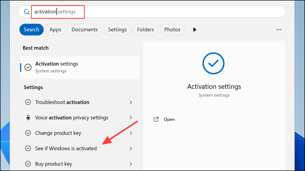 Step 1: On the Windows taskbar, type Activation in the search box and select See if Windows is activated from the results.