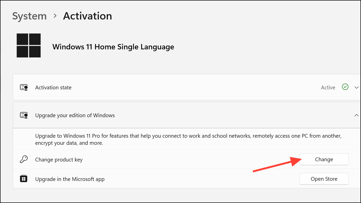 Step 2: If a product key is displayed, enter it in the Change product key section in activation settings. If no key is shown, your system likely does not have a BIOS-embedded key.