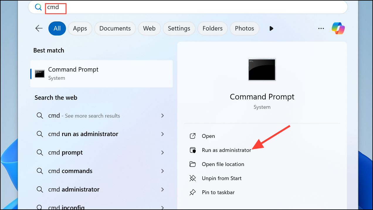 Step 1: Open the Start menu, type cmd, right-click Command Prompt, and select Run as administrator.