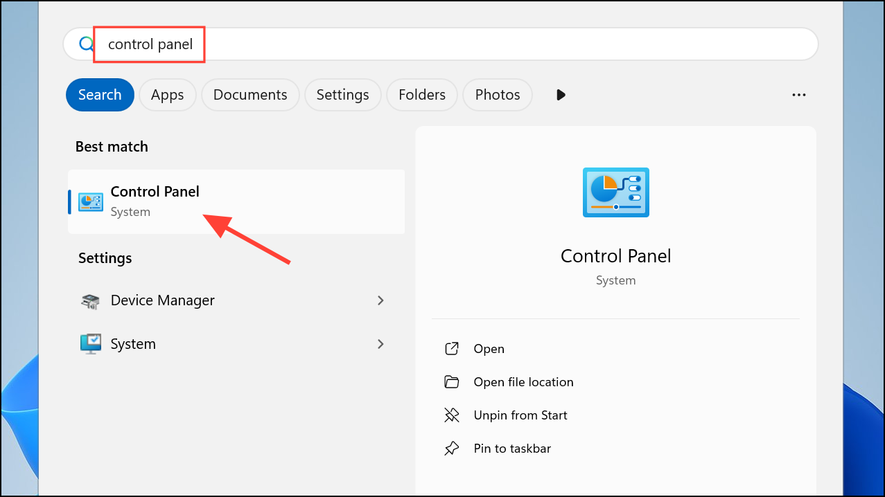 Step 1: Open the Control Panel by selecting the Start menu and typing Control Panel. Choose the Control Panel app from the results.