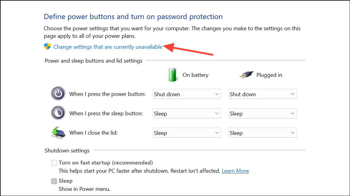 Step 3: At the top of the window, click Change settings that are currently unavailable to unlock the shutdown settings.