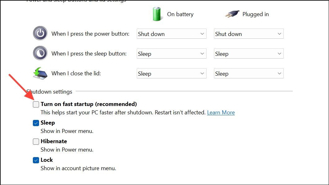 Step 4: Scroll to the Shutdown settings section. Uncheck Turn on fast startup (recommended). This feature speeds up boot times by caching system files, but can cause the system to power off instead of restarting.