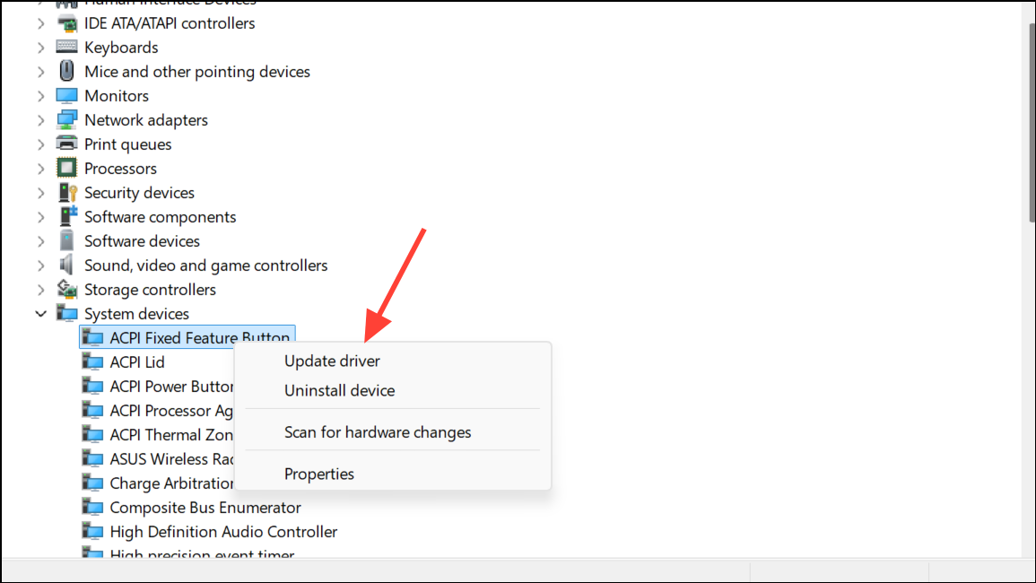 Step 3: Right-click each device and choose Update driver, then select Search automatically for drivers. Pay special attention to the Intel Management Engine Interface (IMEI) and network adapters, as outdated drivers can impact power control.