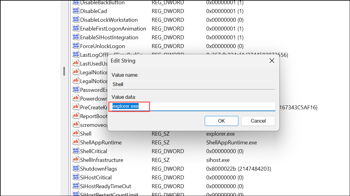 - On the right side, check the values of the entries Shell and Userinit by double-clicking them. The value for Shell should be explorer.exe, while that for Userinit should be C:\WINDOWS\system32\userinit.exe.