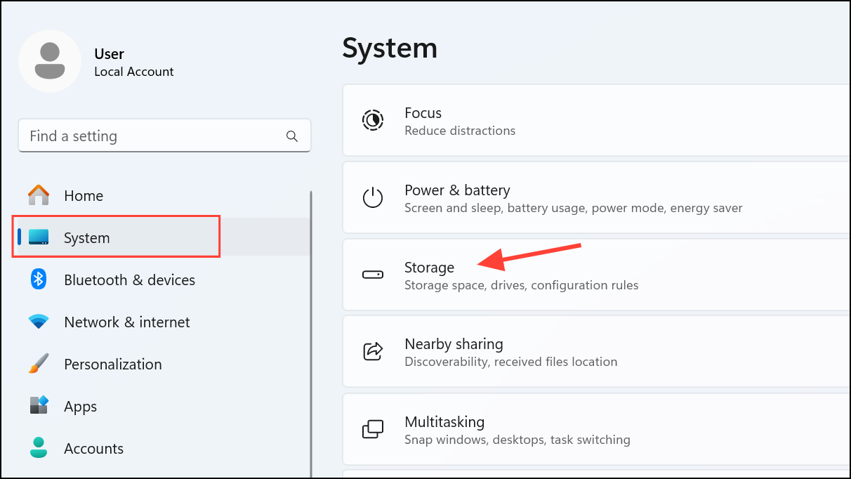 Step 1: Check available disk space on your system drive. Open Settings and go to System > Storage. If your drive is nearly full, Windows updates may fail due to insufficient space.