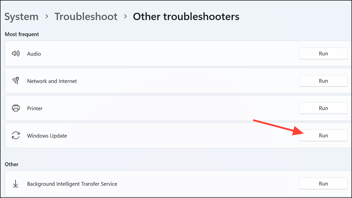 Step 2: ClickOther troubleshooters, and then Run next to Windows Update. Follow the prompts and apply any recommended fixes.