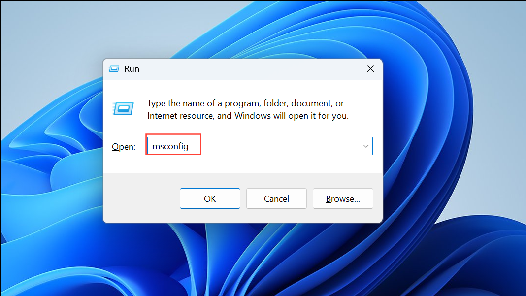 Step 2: Press Win + R, type msconfig, and press Enter.