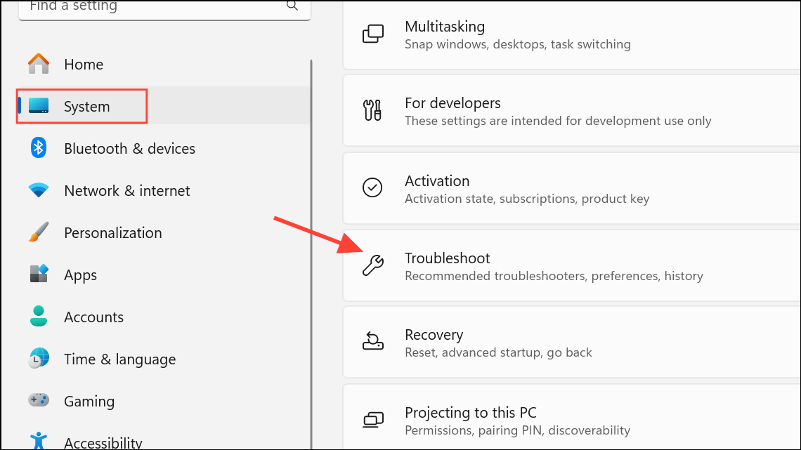 Step 1: Open the Windows Settings app by pressing Win + I. Navigate to System, then select Troubleshoot from the list.