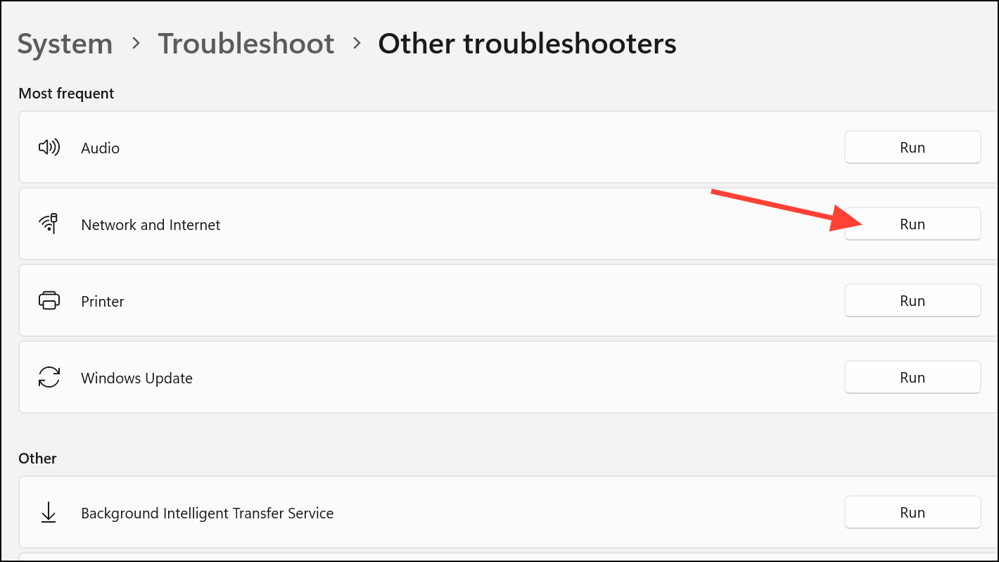 Step 2: Click on Other troubleshooters. Find Network and Internet and click Run. Follow the on-screen instructions to allow Windows to automatically diagnose and resolve network issues.