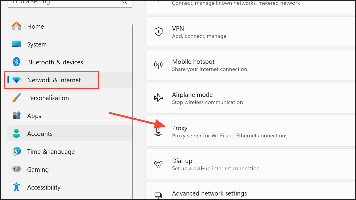 Step 1: In Windows Settings, go to Network & internet and select Proxy.
