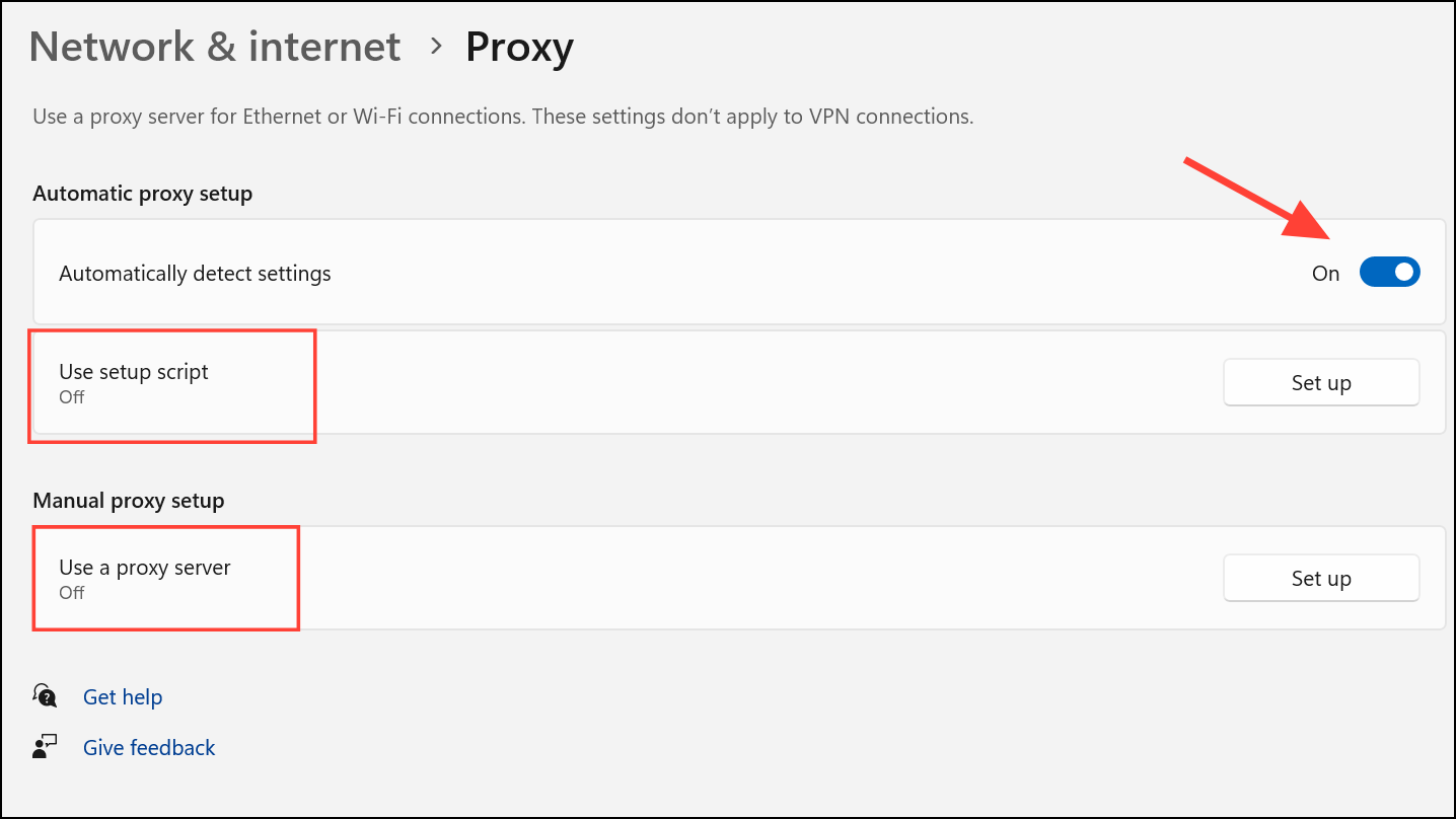 Step 2: Ensure the Automatically detect settings toggle is turned on. For most home networks, Use setup script and Use a proxy server should be set to Off unless you have specific instructions from your network administrator.