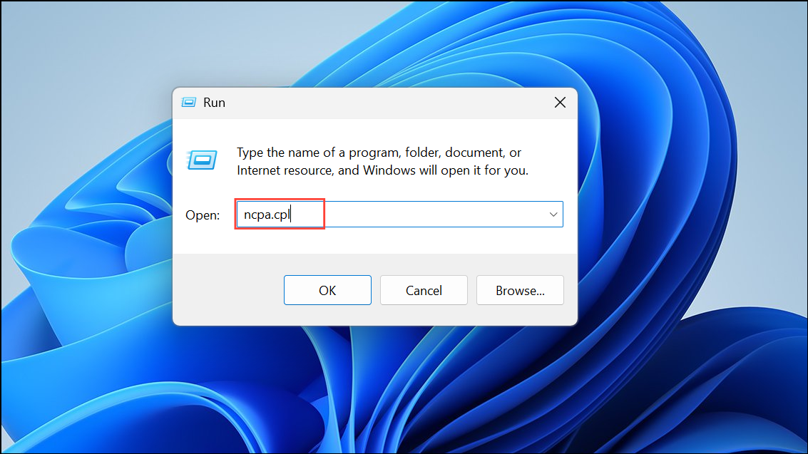 Step 1: Press Win + R to open the Run dialog, type ncpa.cpl, and press Enter.