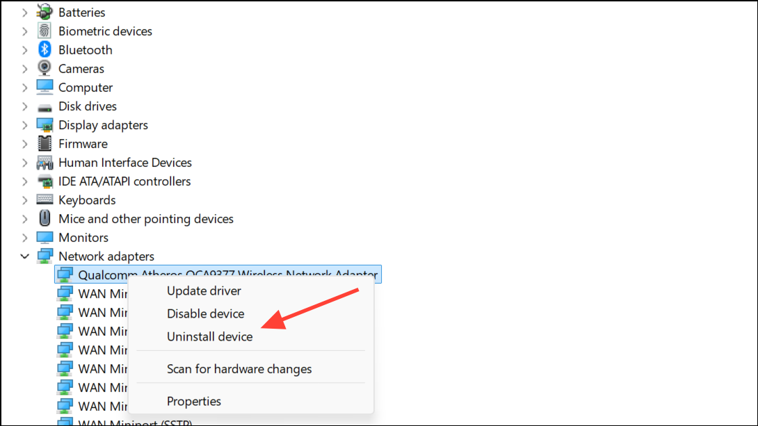 Step 3: If updating does not resolve the issue, right-click the adapter again and select Uninstall device. Restart your computer to allow Windows to reinstall the driver automatically.