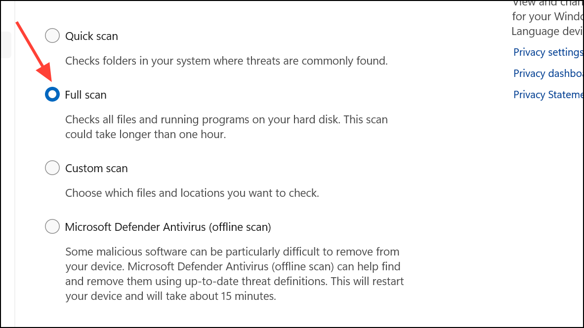 Step 1: Open Windows Security by searching from the Start menu. Select Virus & threat protection and run a Full scan.