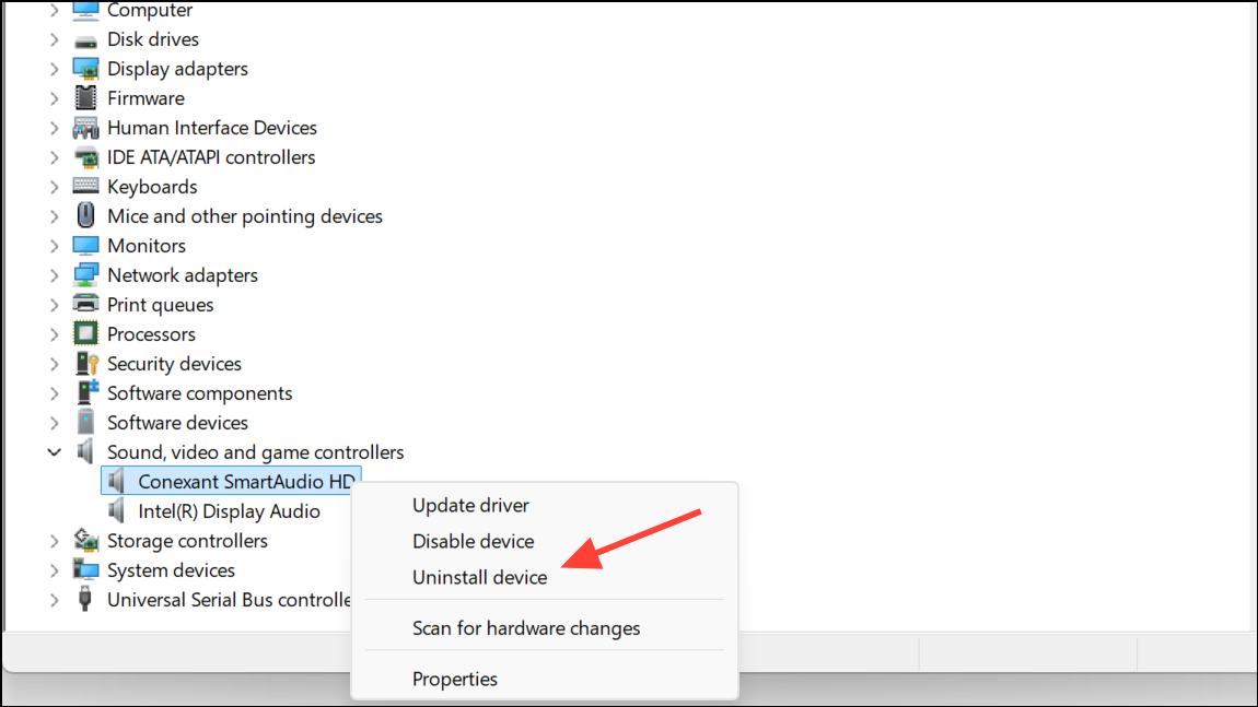 Step 3: Right-click your main audio device (such as Realtek, Creative, or your motherboard’s sound card) and select Uninstall device. Confirm the uninstallation. Restart your PC to fully remove the old driver.