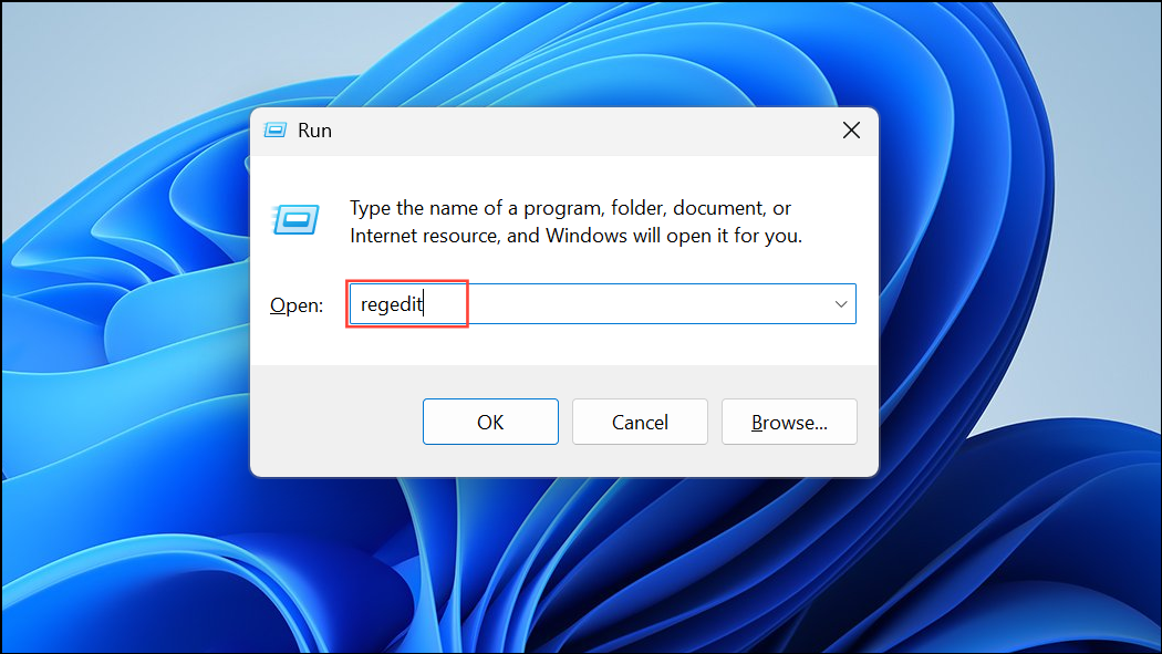 Step 1: Press Win + R, type regedit, and press Enter. Back up your registry before making changes.